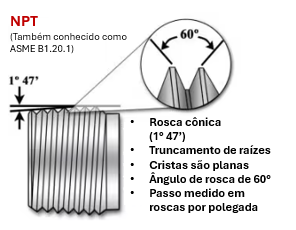 O NPT continua sendo o padrão de rosca dominante para conexões de processos industriais nos Estados Unidos, assim como no Brasil.